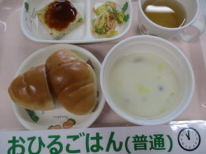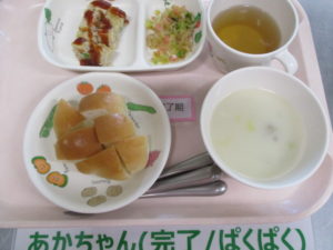 ★3/24(木)★今日の給食・おやつ 2022/03/24 ★幼 児★ <メニュー> ロールパン、ミートローフ、キャベツと桜えびのサラダ、豆乳のスープ —————— ★離乳食★ <メニュー> ロールパン、ミートローフ、キャベツと桜えびのサラダ、豆乳のスープ ===================================== 【 おやつ 】 <メニュー> 麦茶、わかめおにぎり