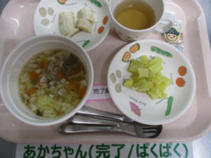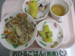 ★4/13(水)★今日の給食・おやつ 2022/04/13 【 給 食 】 ★幼 児★ <メニュー> 春野菜のあんかけうどん、さつまいもの甘煮、チーズ、バナナ —————— ★離乳食★ <メニュー> 春野菜のあんかけうどん、さつまいもの甘煮、チーズ、バナナ ===================================== 【 おやつ 】 <メニュー> 麦茶、ひじきおにぎり