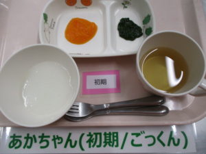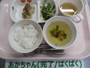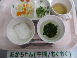 (中期食)五倍粥、高野豆腐と人参の煮物、きゅうり煮、小松菜の味噌汁