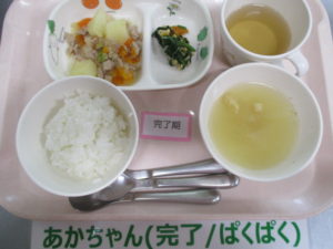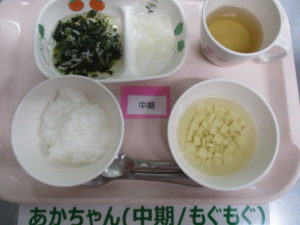 (中期食)五倍粥、しらすとほうれん草の煮物、大根煮、豆腐のすまし汁