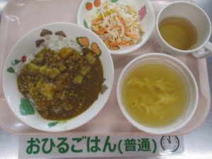 大豆ミートのカレーライス、切干大根のマヨサラダ、卵のスープ
