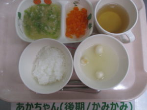 (中期食)五倍粥、カレイと絹さやの煮物、人参煮、麩の味噌汁