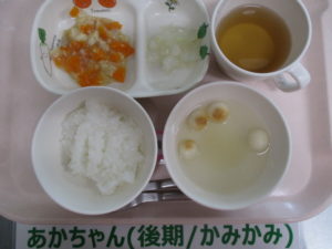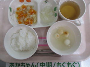(中期食)五倍粥、カレイと人参の煮物、玉ねぎ煮、麩の味噌汁