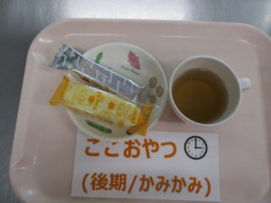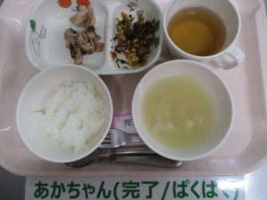 (完了期)ご飯、鶏肉の青のり焼き、すき昆布煮、里芋の味噌汁
