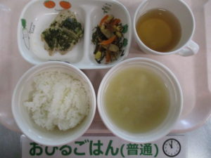 ご飯、鶏肉の青のり焼き、すき昆布煮、里芋の味噌汁