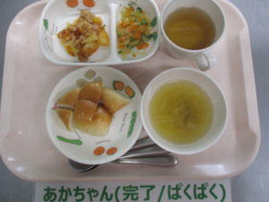 (中期食)パン粥、ツナとじゃが芋の煮物、きゅうり煮、人参のスープ
