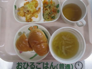 (完了期)ロールパン、じゃが芋のミートグラタン、春雨サラダ、白菜としめじのスープ