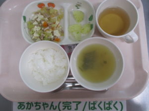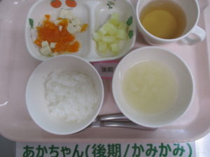 (中期食)五倍粥、豆腐と人参の煮物、じゃがいも煮、玉ねぎの味噌汁