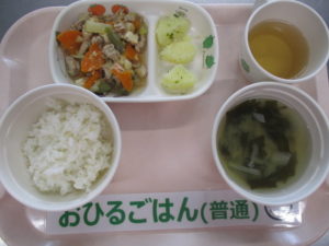 麦ごはん、すき焼き風煮、粉ふき芋、わかめの味噌汁