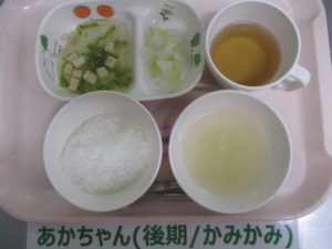 (中期食)五倍粥、高野豆腐と絹さやの煮物、キャベツ煮、玉ねぎの味噌汁