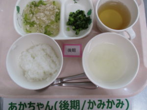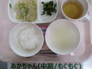 (中期食)五倍粥、鶏ひき肉と絹さやの煮物、小松菜煮、大根の味噌汁