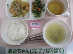 (完了期)麦ごはん、厚揚げのそぼろ煮、小松菜の納豆和え、大根の味噌汁
