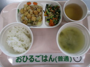 麦ごはん、厚揚げのそぼろ煮、小松菜の納豆和え、大根の味噌汁