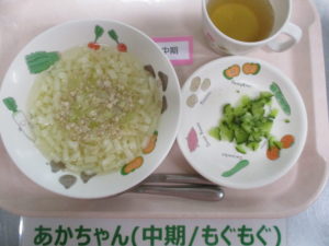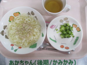 (後期食)あんかけうどん(鶏ひき肉・キャベツ)、きゅうり煮