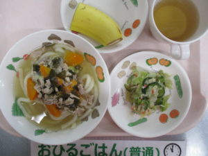 (中期食)あんかけうどん(鶏ひき肉・キャベツ)、きゅうり煮