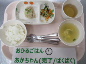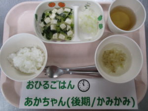 (中期食)五倍粥、豆腐とチンゲン菜の煮物、玉ねぎ煮、もやしのスープ