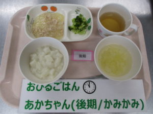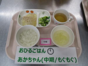 (中期食)パン粥、鶏ひき肉と玉ねぎの煮物、ブロッコリー煮、キャベツのスープ