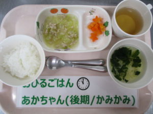 (後期食)五倍粥、鶏ひき肉とキャベツの煮物、人参煮、ほうれん草のそうめん汁
