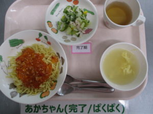 (完了期)ミートソーススパゲティ、ささ身サラダ、洋風卵スープ、ゼリー