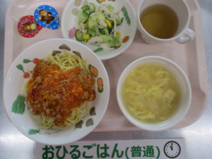 ミートソーススパゲティ、ささ身サラダ、洋風卵スープ、ゼリー