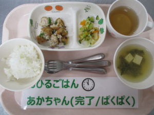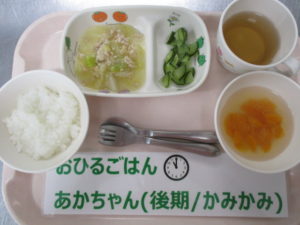 (完了期)軟飯、にぎり揚げ、おかか和え、わかめと豆腐の味噌汁