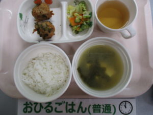 麦ごはん、にぎり揚げ、おかか和え、わかめと豆腐の味噌汁