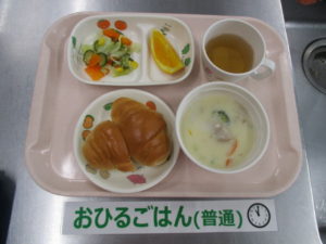 ロールパン、クリームシチュー、フレンチサラダ、オレンジ