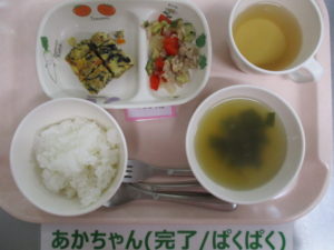 (完了期)軟飯、ひじき入りオムレツ、夏野菜炒め、中華スープ
