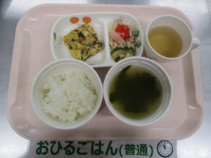 ご飯、ひじき入りオムレツ、夏野菜炒め、中華スープ