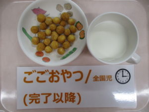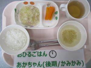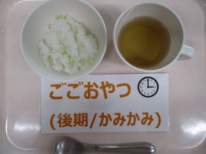 ★7/20(水)★今日の給食・おやつ 2022/07/20 【給 食】 ★幼 児★ 〈メニュー〉 五目そぼろ丼、磯香和え、かきたま汁 ———————— ★離乳食★ 〈メニュー〉 (中期食)該当園児なし (後期食)五倍粥、鶏ひき肉とキャベツの煮物、人参煮、もやしのスープ (完了期)五目そぼろ丼、磯香和え、かきたま汁 =================== 【おやつ】 〈メニュー〉 (後期食)麦茶、野菜粥 (完了期以降食)牛乳、きな粉スナッ麩