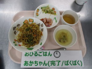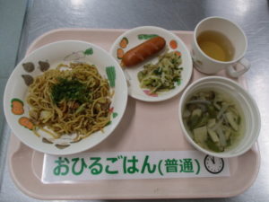 (完了期)焼きそば、フランクフルト、もやしときゅうりのナムル、きのこのスープ