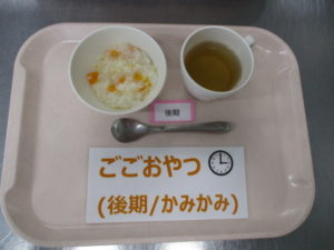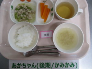 (後期食) 五倍粥、鶏ひき肉と絹さやの煮物、人参スティック、もやしの味噌汁