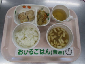 (完了期)軟飯、鶏肉の照り焼き、切り干し大根の煮物、もやしと油揚げの味噌汁