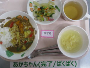 (完了期)夏野菜カレー、カミカミサラダ」、卵のスープ