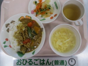 夏野菜カレー、カミカミサラダ」、卵のスープ