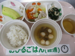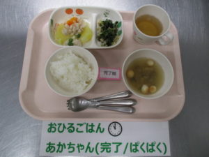 (完了期)軟飯、塩鶏肉じゃが、磯香和え、麩としめじの味噌汁