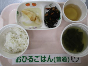 麦ごはん、白身魚の西京焼き、ひじきの含め煮、小松菜と玉ねぎのすまし汁