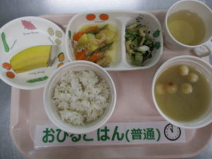 麦ごはん、鶏肉じゃが、磯香和え、麩としめじの味噌汁、バナナ