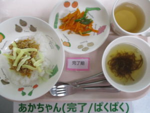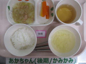 【後期食】五倍粥、ツナとキャベツの煮物、人参スティック、たまねぎのスープ