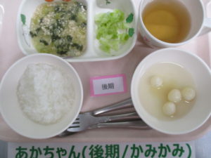 【後期食】五倍粥、鶏ひき肉とチンゲン菜の煮物、キャベツ煮、麩の味噌汁