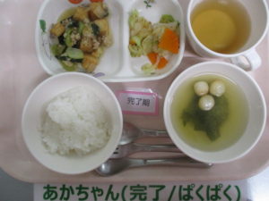 【完了食】軟飯、厚揚げのそぼあんかけ、キャベツと人参のごま和え、麩とわかめの味噌汁