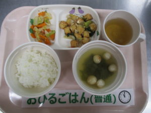 麦ごはん、厚揚げのそぼあんかけ、キャベツと人参のごま和え、麩とわかめの味噌汁
