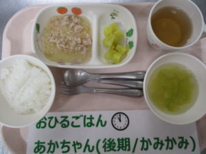 【後期食】五倍粥、鶏ひき肉と玉ねぎの煮物、さつまいも煮、キャベツのスープ