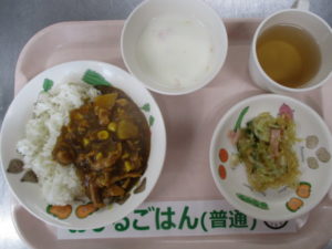 さつまいもカレー、春雨サラダ、みかんヨーグルト