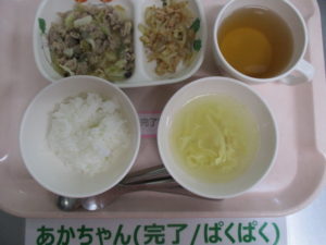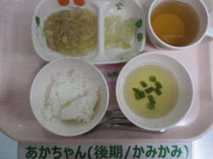 【後期食】五倍粥、ツナとキャベツの煮物、玉ねぎ煮、いんげんのスープ