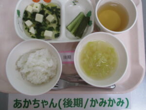 【後期食】五倍粥、豆腐と小松菜の煮物、きゅうりスティック、白菜の味噌汁