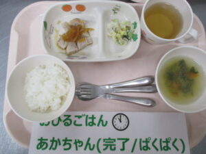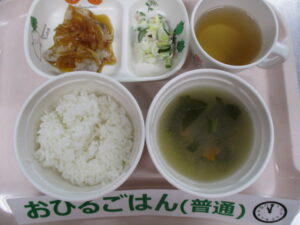 ご飯、鶏肉のオニオンソースがけ、カニカマサラダ、小松菜と人参の味噌汁