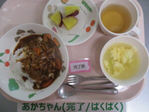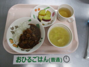 ハヤシライス、さつま芋のレモン煮、卵スープ