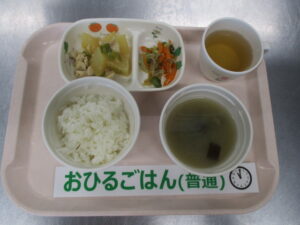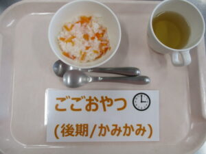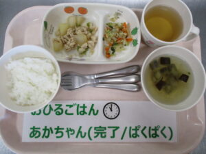 【後期食】五倍粥、鶏ひき肉と人参の煮物、大根スティック、茄子の味噌汁