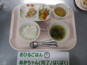 【完了食】軟飯、鮭のマヨコーンクリーム焼き、豚肉とじゅが芋のきんぴら、ほうれん草と玉ねぎの味噌汁